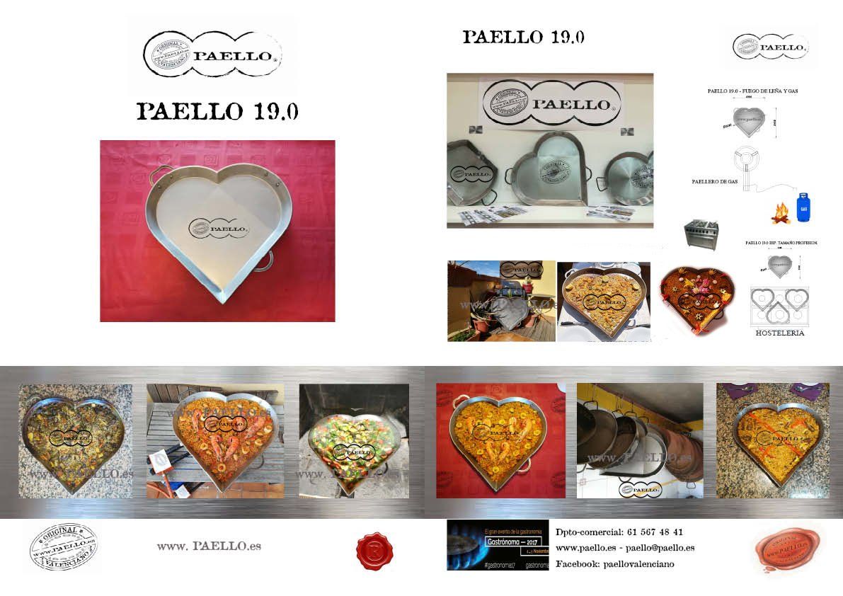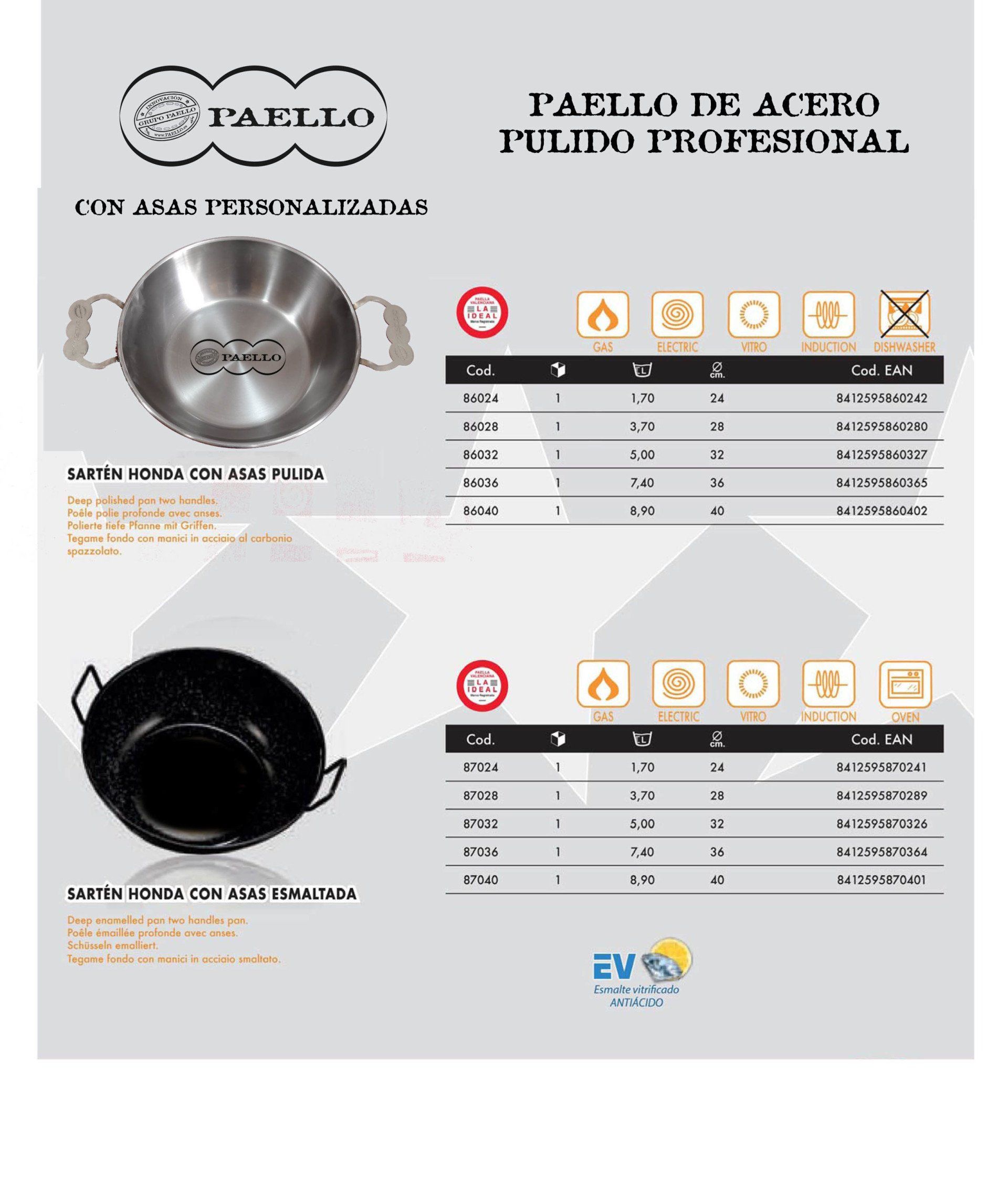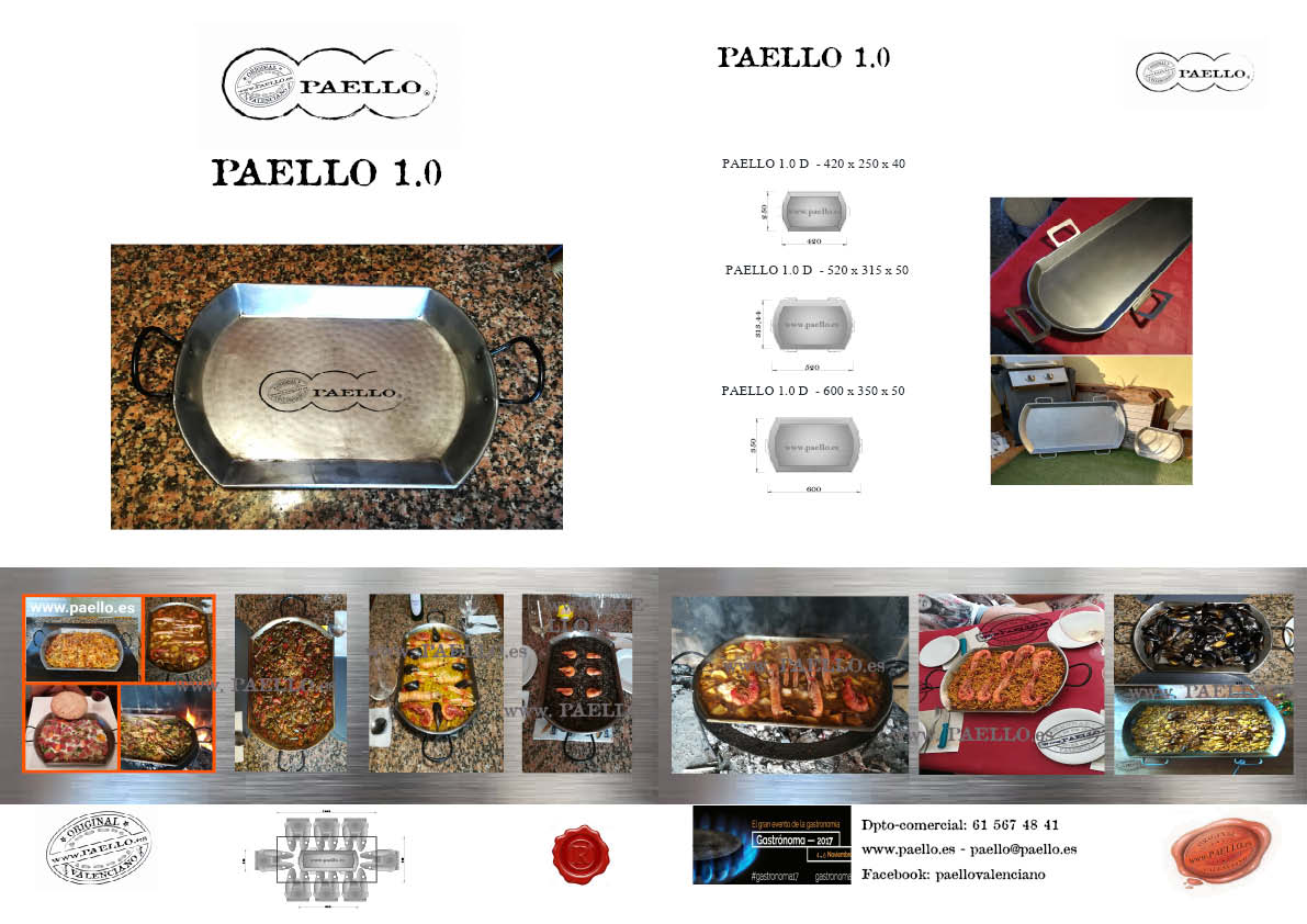 Existe varios productos ORIGINAL PAELL@ VALENCIAN@, por sus dimensiones, calidades y formas, para cocinar a Gas natural, gas propano, Horno, Inducción, vitrocerámica y a leña. Los Acabados de PAELL@ VALENCIAN@ pueden ser de Aluminio, acero pulido e inoxidables, Esmaltados, antiadherentes de hierro fundido y con más o menos profundidad para diferentes recetas, asadoras y planchas, patas, paravientos, paelleros ...