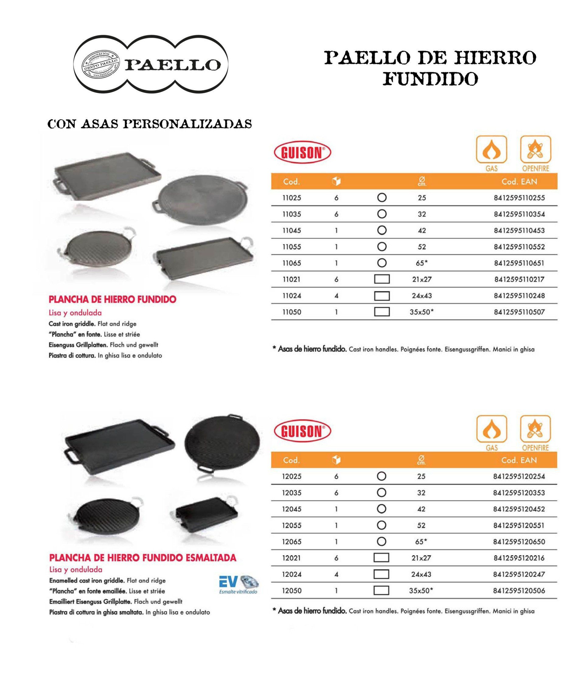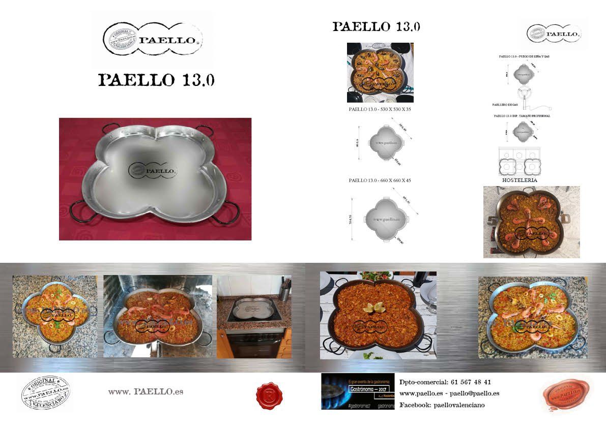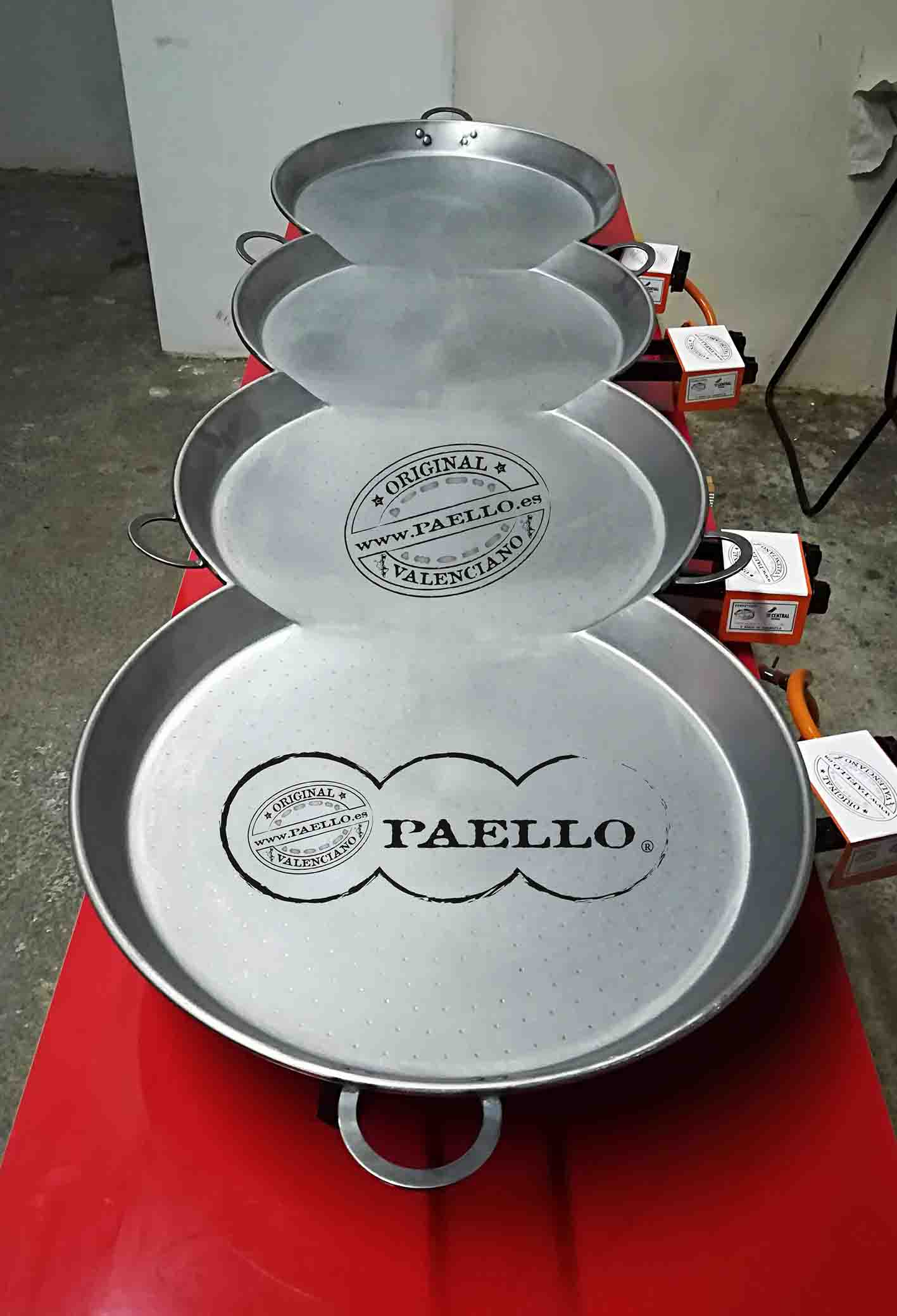 Existe varios productos ORIGINAL PAELL@ VALENCIAN@, por sus dimensiones, calidades y formas, para cocinar a Gas natural, gas propano, Horno, Inducción, vitrocerámica y a leña. Los Acabados de PAELL@ VALENCIAN@ pueden ser de Aluminio, acero pulido e inoxidables, Esmaltados, antiadherentes de hierro fundido y con más o menos profundidad para diferentes recetas, asadoras y planchas, patas, paravientos, paelleros ...