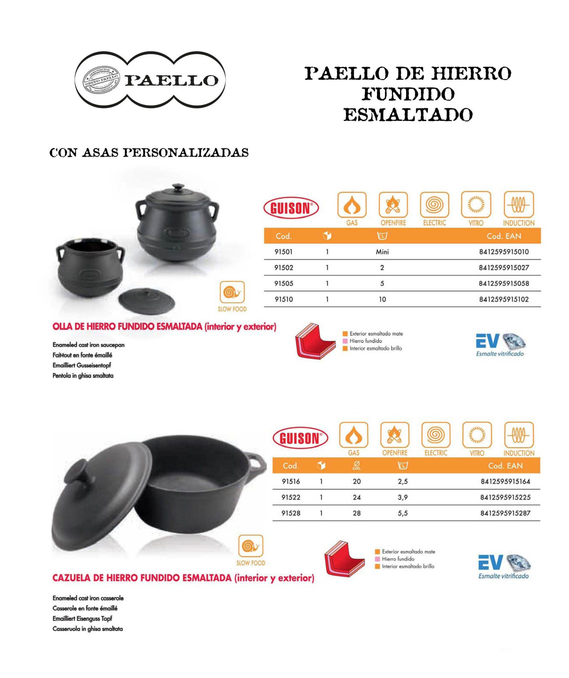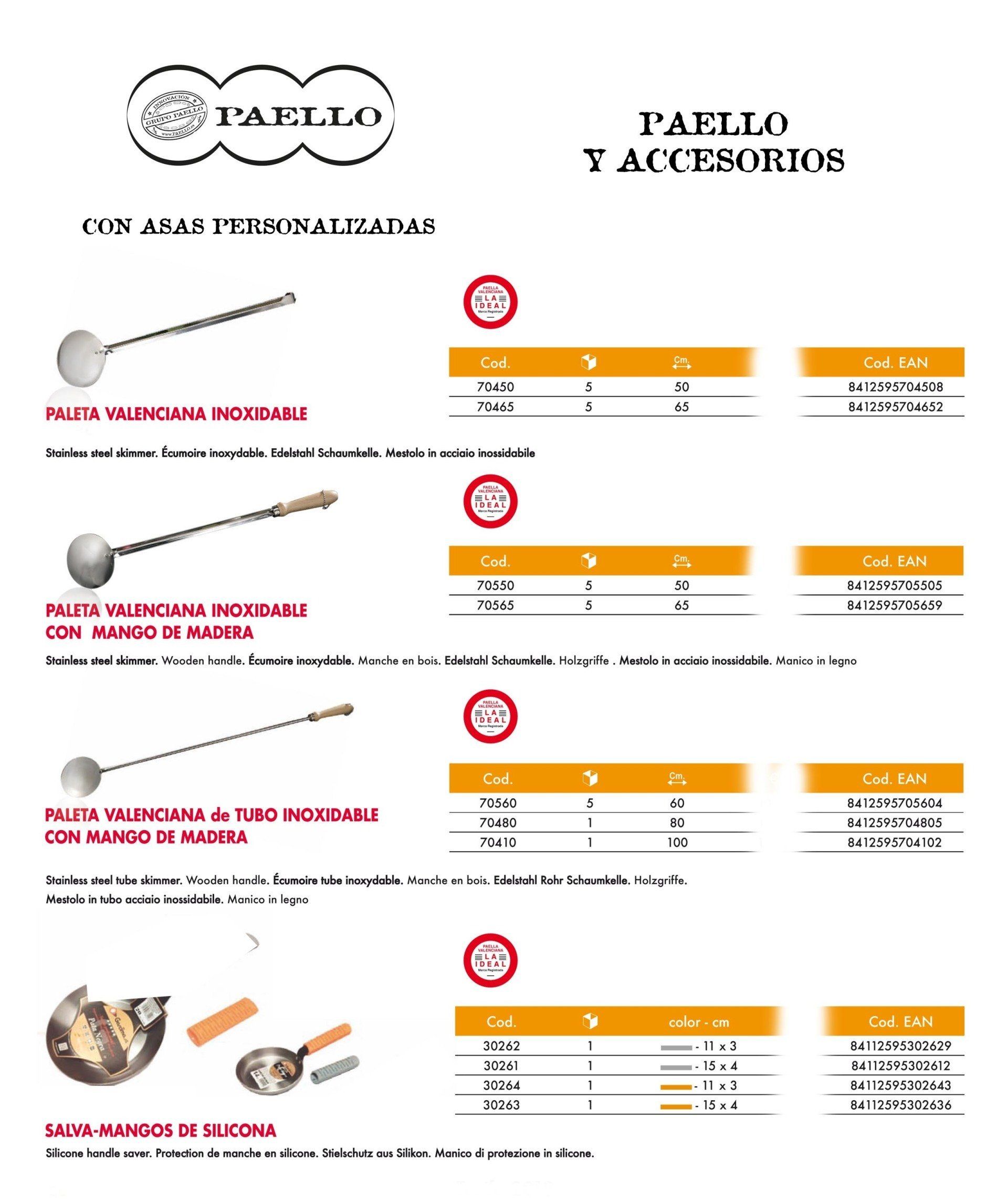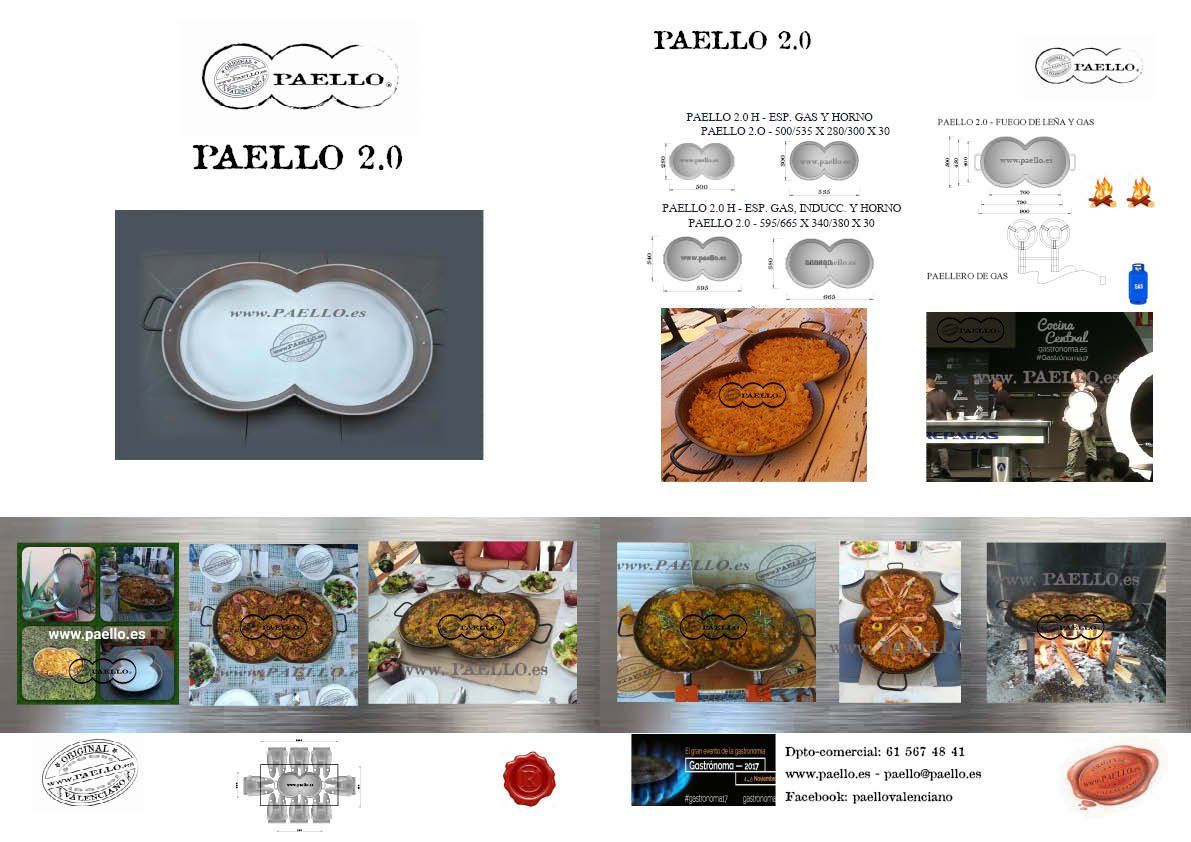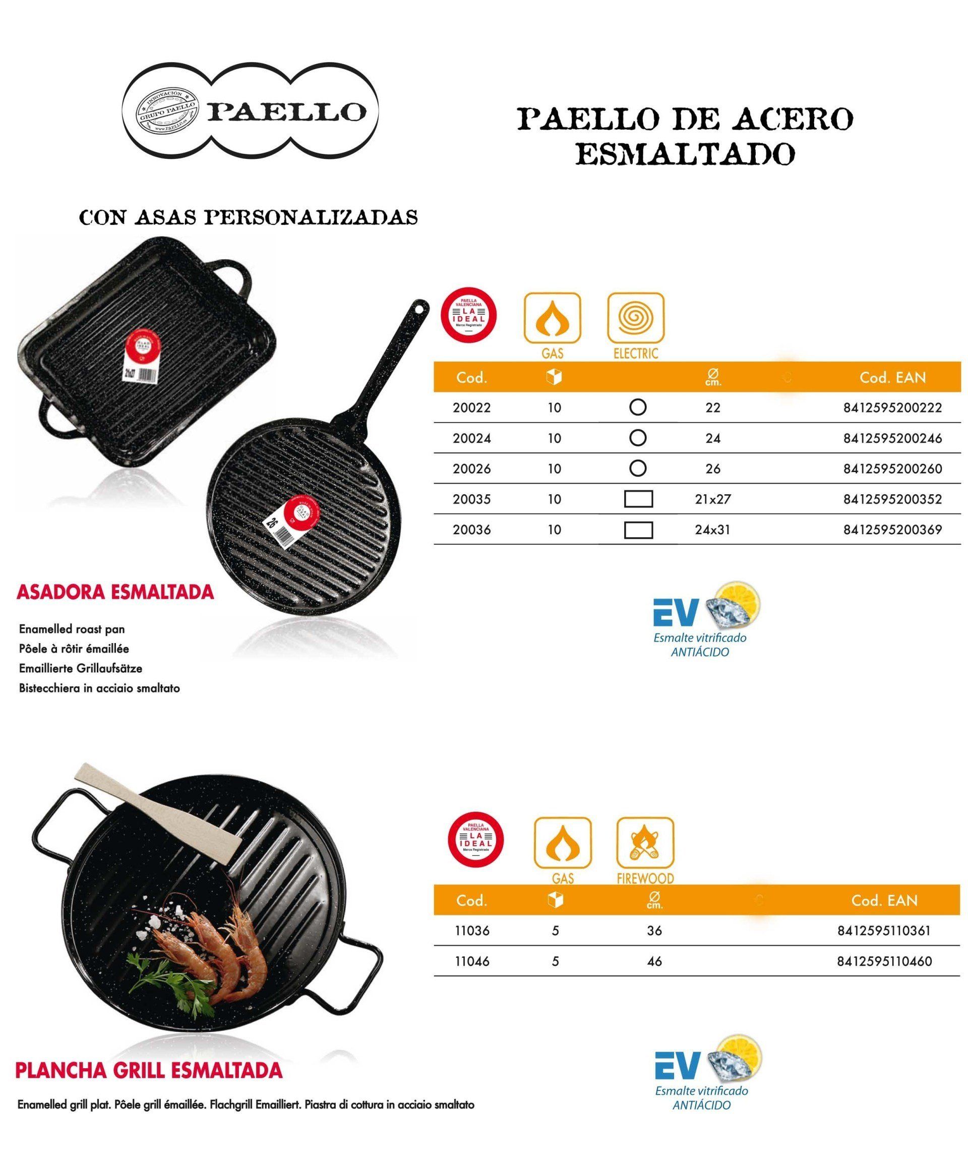 Existe varios productos ORIGINAL PAELL@ VALENCIAN@, por sus dimensiones, calidades y formas, para cocinar a Gas natural, gas propano, Horno, Inducción, vitrocerámica y a leña. Los Acabados de PAELL@ VALENCIAN@ pueden ser de Aluminio, acero pulido e inoxidables, Esmaltados, antiadherentes de hierro fundido y con más o menos profundidad para diferentes recetas, asadoras y planchas, patas, paravientos, paelleros ...